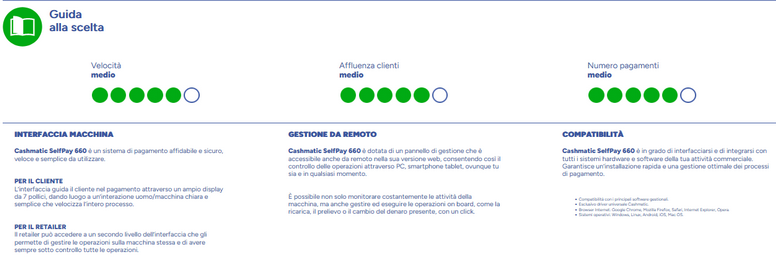 Cashmatic SelfPay 460 è la nuova cassa automatica che si colloca tra SelfPay 360 e 660. È il cassetto automatico più compatto, ma con una marcia in più. Rappresenta il giusto equilibrio tra compattezza e versatilità, mantenendo le caratteristiche funzionali che premiano tutte le SelfPay di Cashmatic.